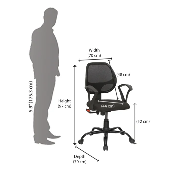 Work in complete comfort with Nilkamal’s Mustang Mesh Chair. Its premium-grade mesh back leaves room for ventilation and keeps your back sweat-free even during extended durations. The soft fabric upholstery on the seat keeps you comfortably seated for hours. With the support of a metal powder-coated base, the Mustang Chair provides security and sturdiness. Moving and reclining on this mid-back chair is as fun as sitting on it. You can move the chair around on the smooth-rolling, twin-wheel nylon castors, while the 120-mm-stroke push-back mechanism allows you to recline. If you want to take your Mustang Chair to new heights (pun intended), the Class-4 BIFMA gas lift has you covered. With one push, you can reach your desired height level. As previously stated, the Mustang Chair is about making your sitting experience as comfortable as possible so you can give your best at work. But, in addition to comfort, we wanted the chair to be a stylish addition to your workspace, so we gave it a classic black colour and a trendy contemporary design. Everything you’ve ever wanted in a mid-back office chair is now available at an unbeatable price, so why wait any longer? Click the buy button now.