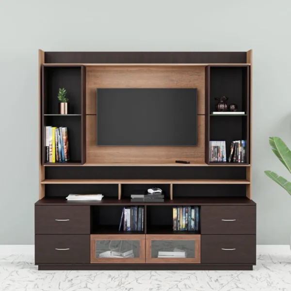 Elevate your living space with the Nilkamal Leron Wall Unit, a perfect combination of style and functionality. Crafted from 18mm thick particle board for durability, this wall unit boasts a modern aesthetic. It features 2 small drawers, 4 large drawers and storage space below the TV panel, providing ample organization options.